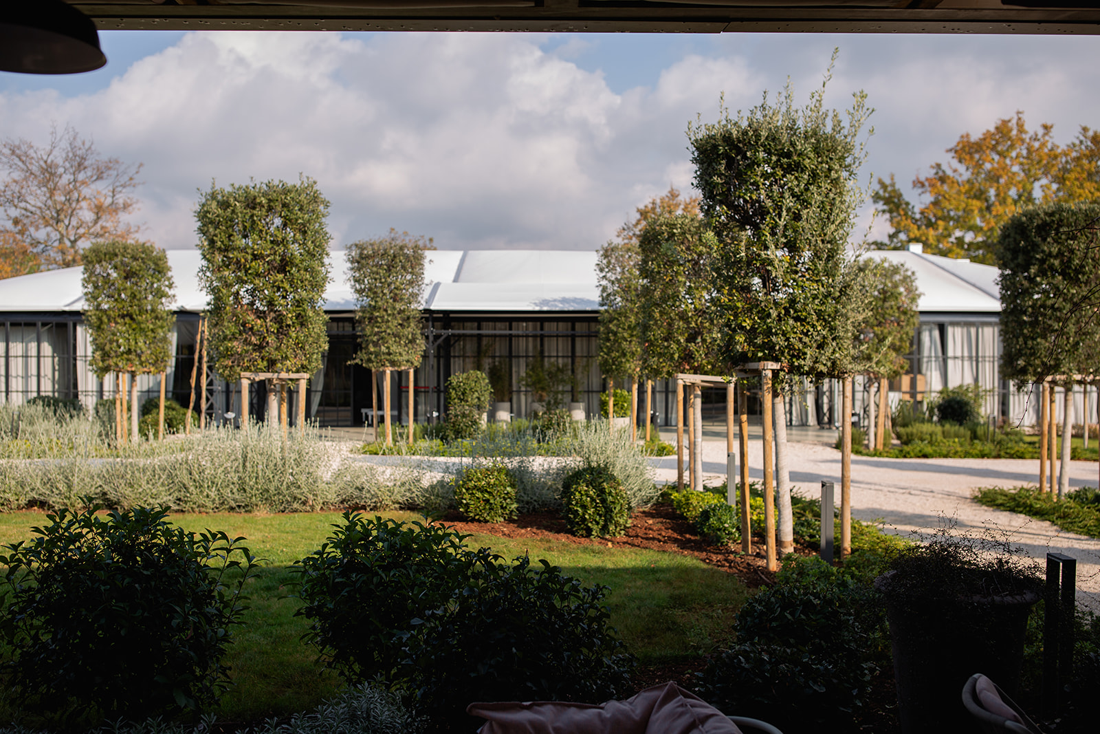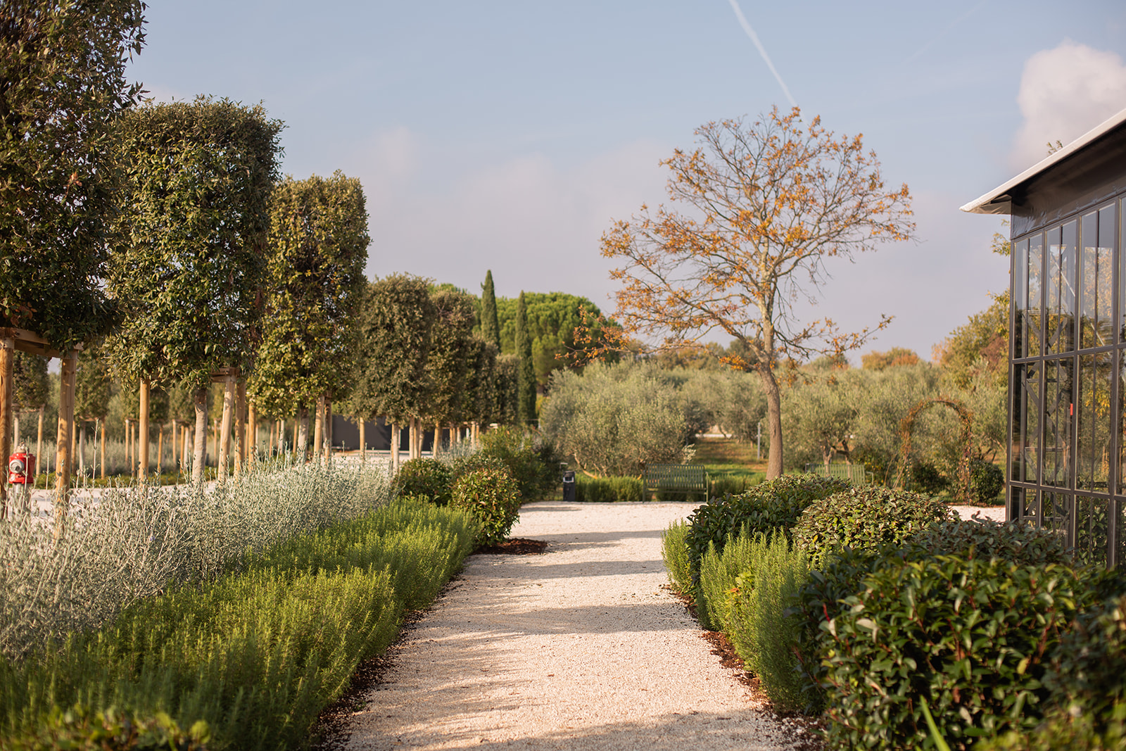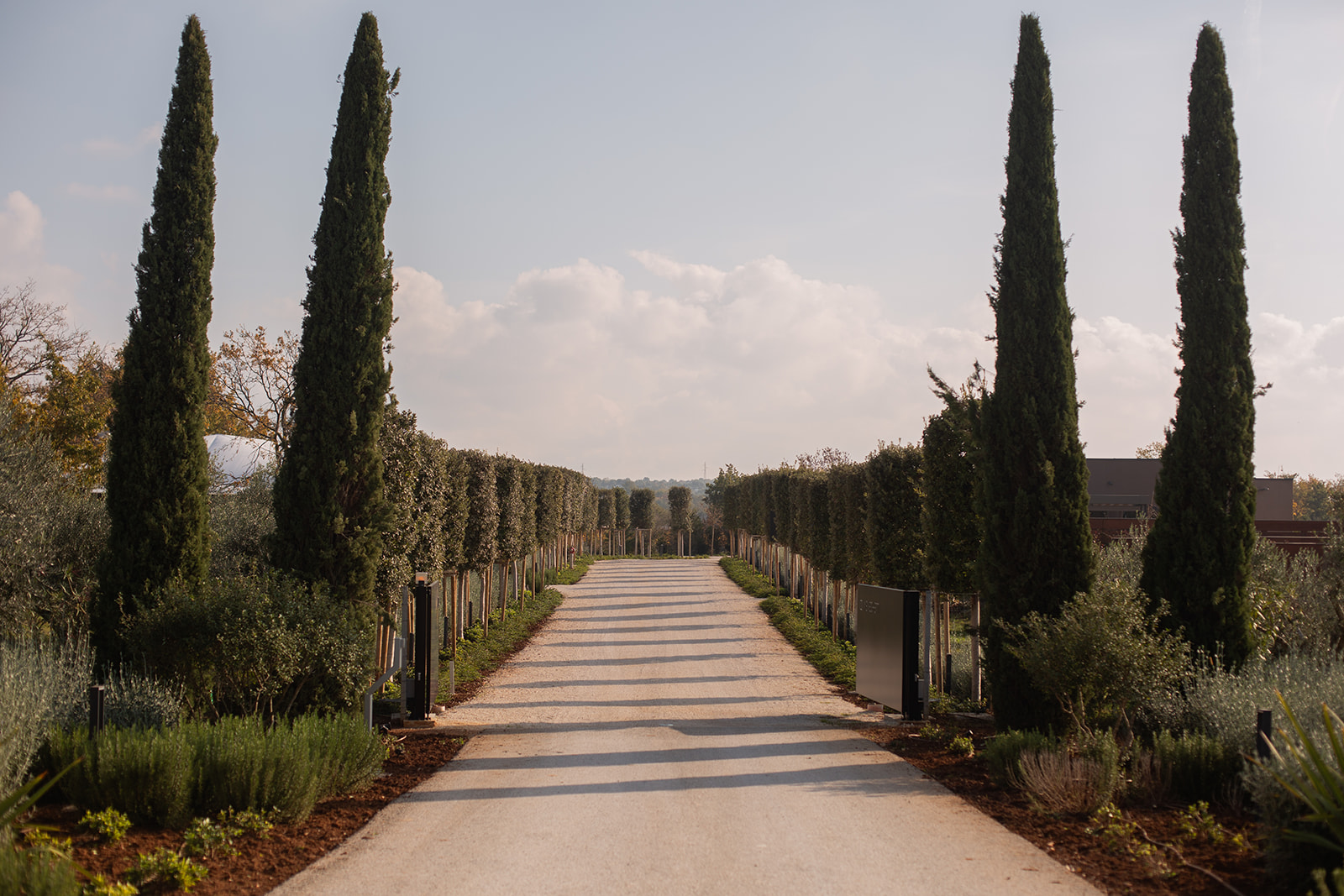 Duga staza obostrano omeđena gotovo vojnički postrojenim stabalima crnike šišane krošnje dominira prostorom Vinarije i čini prirodan prijelaz prema dominantnim pinijama. Aleja vodi do dva objekta položena nasuprotno: prostora kušaone, neupadljive i jednostavne prizemne zgrade s terasom, čije se funkcije odvijaju tijekom dana te orangerya, nenametljive staklene konstrukcije, u kojoj se aktivnosti odvijaju povremeno uz okupljanje većeg broja posjetitelja. Oba objekta se čine nevidljivim i decentnim dodatkom aleji.
