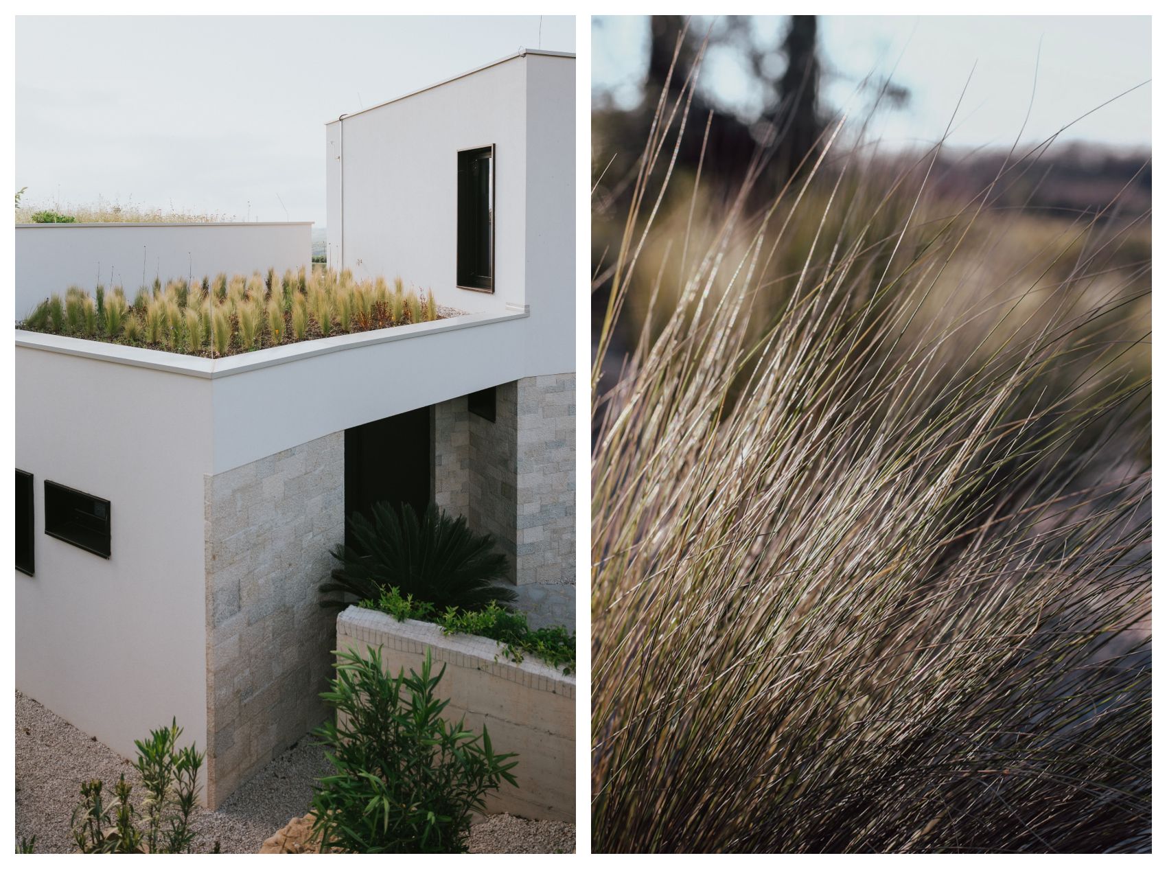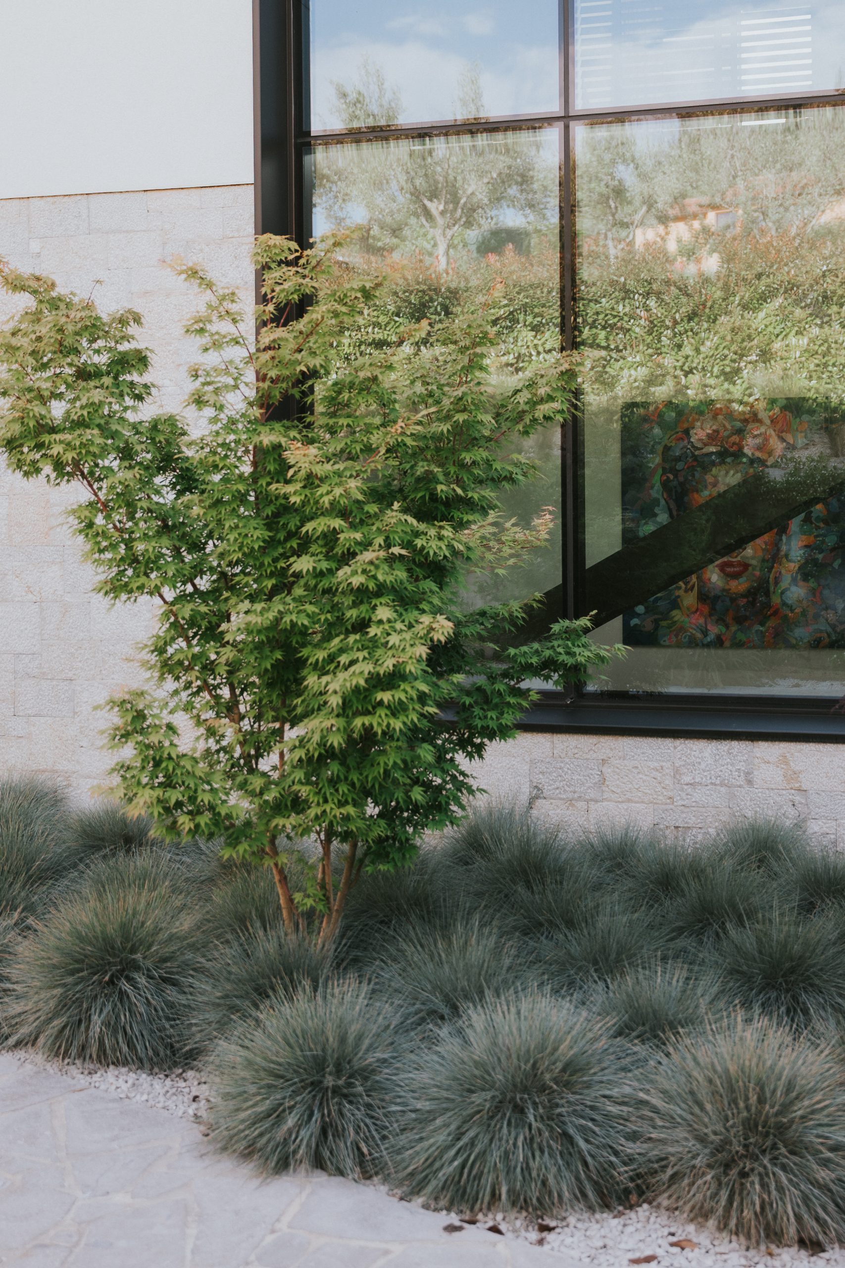 Vrt sadrži nekoliko sekcija: čiste plohe livade sa stablima, travnjak, miješane gredice, više volumene živice i podzid obučen u penjačice te krovni vrt, a središtu samog objekta i atrijski vrt.