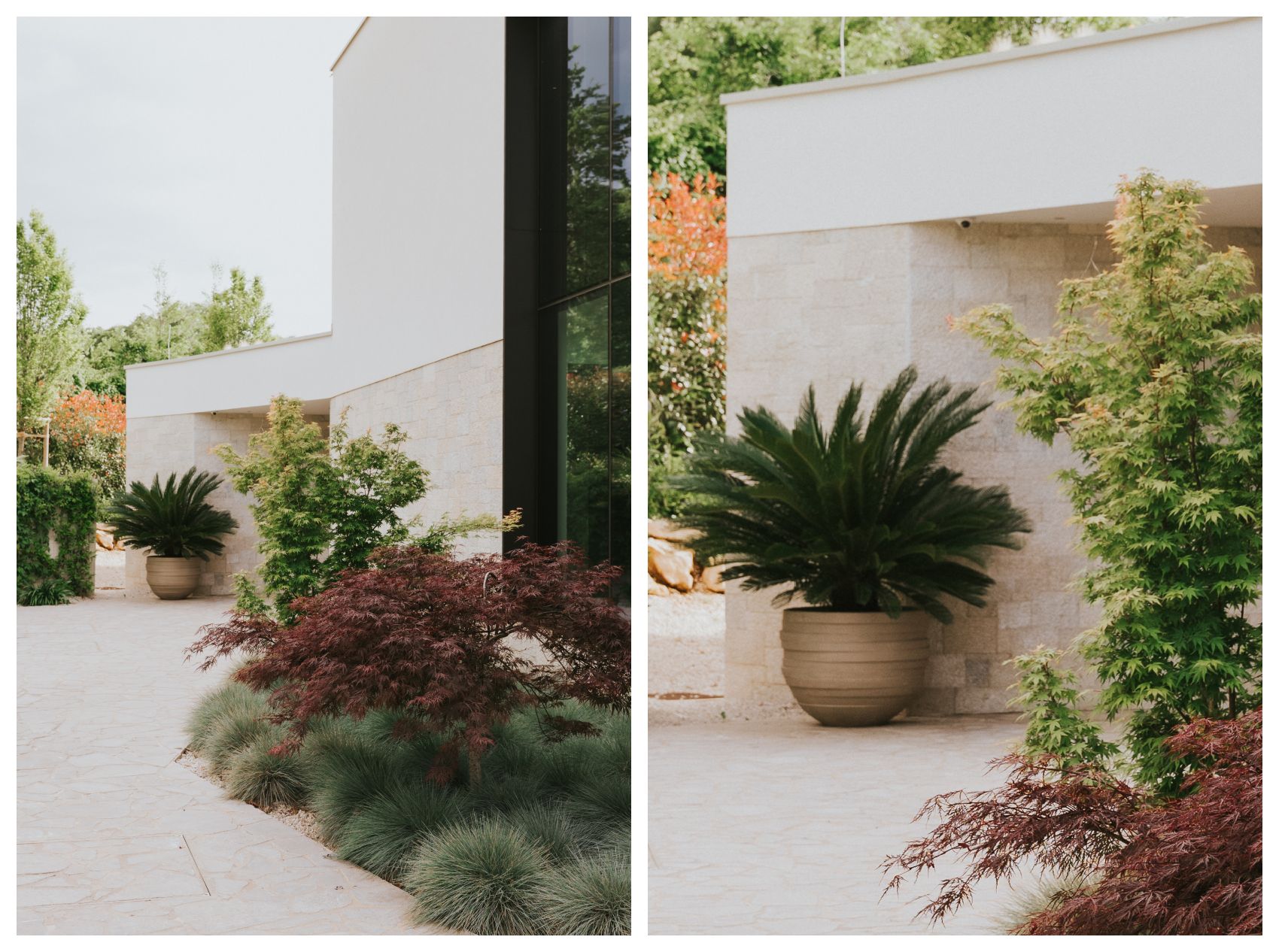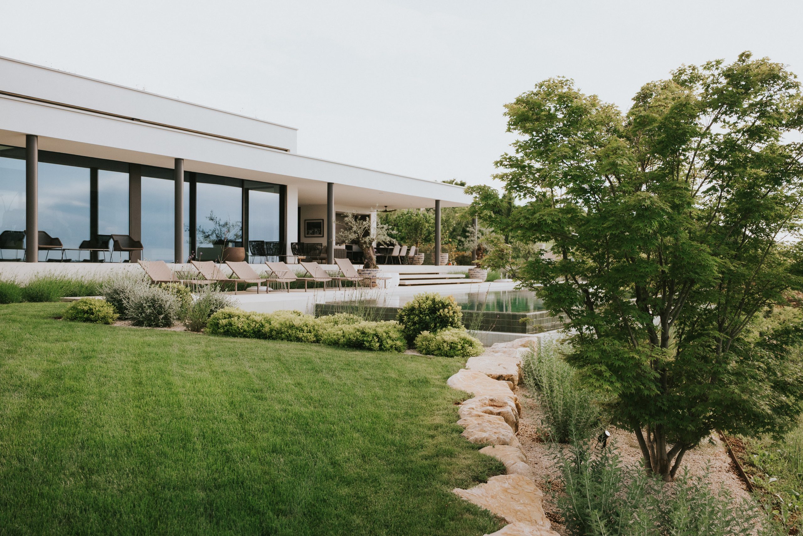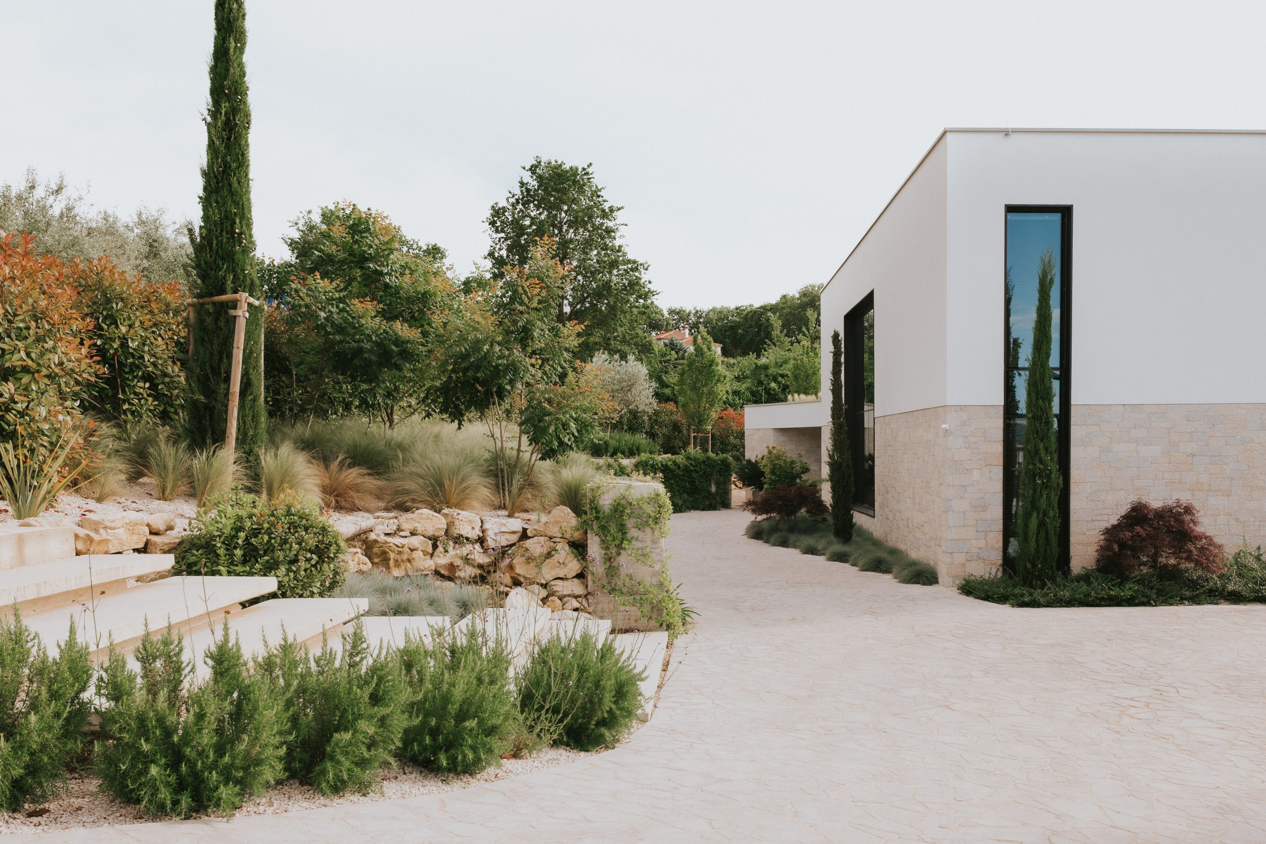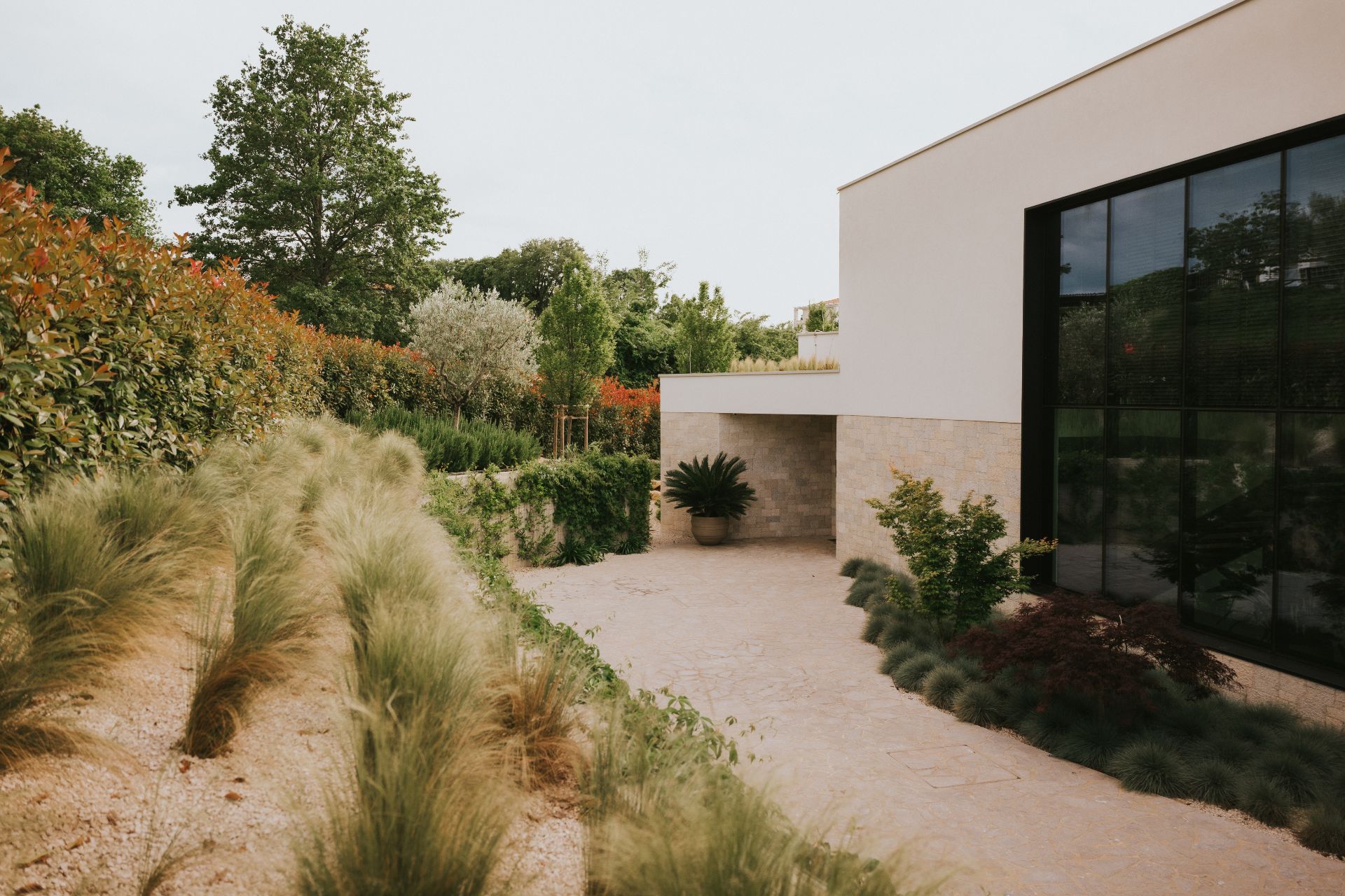 Moderna, jednostavna, a opet impozantna građevina, središte je nagnute parcele na oko 5000 m2. Karakter vlasnika u relaciji je s objektom, stoga je vrt trebao prigrliti te osobine –  biti vidljiv, a nenametljiv entitet u širem prostoru kultiviranog krajobraza.