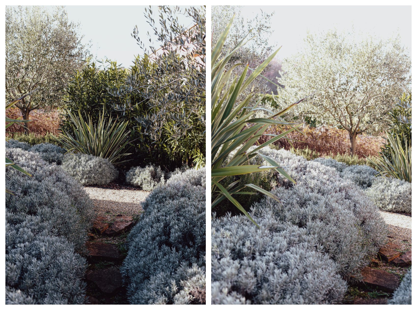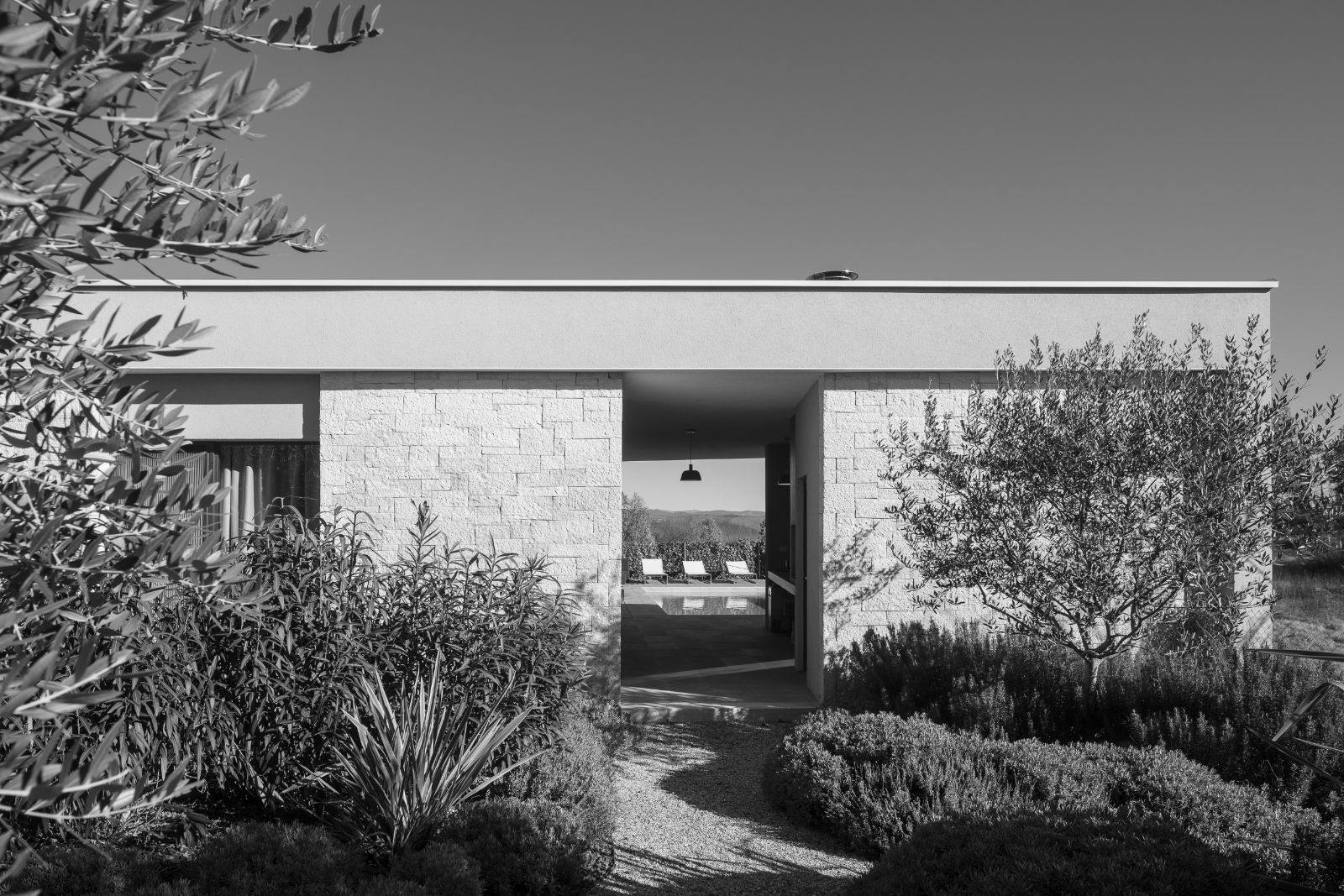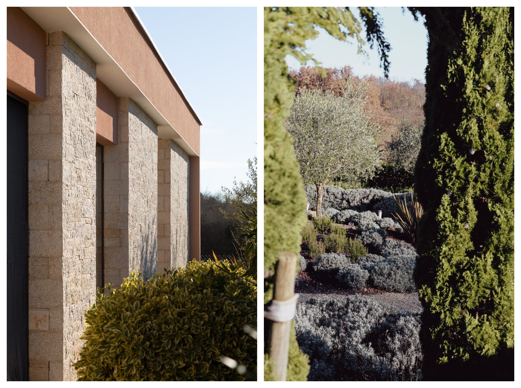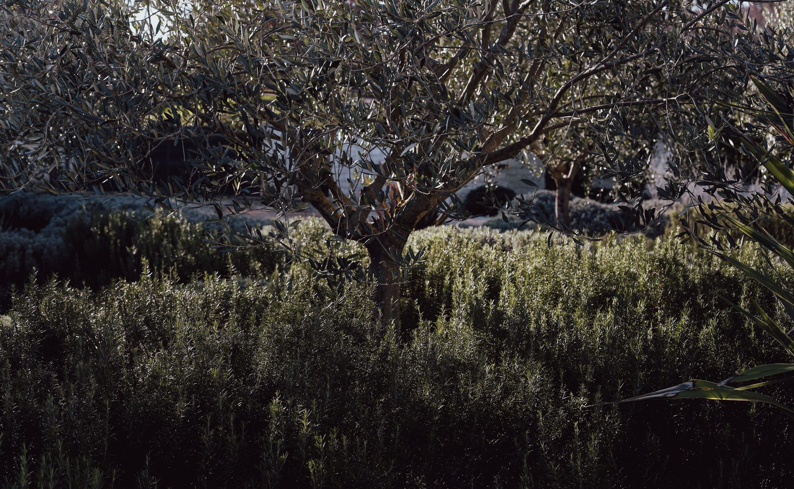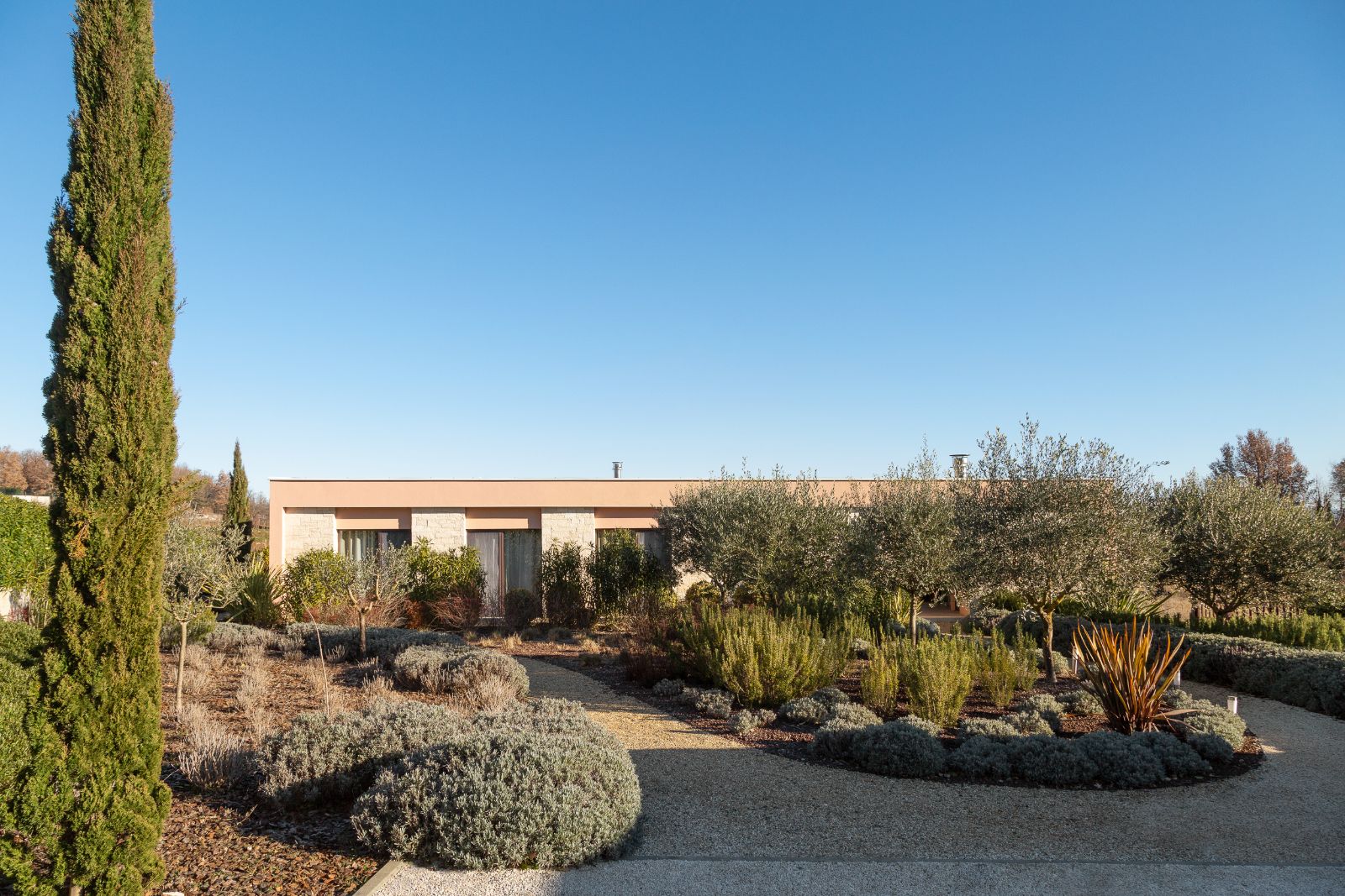 Gotovo cijela ploha vrta ispunjena je niskim biljem, izuzev šljunčanih staza i prilaza objektu, a sve u svrhu da se čim više približi okolišu od kojeg je oduzet. Visoki volumeni svedeni su na nekoliko čempresa postavljenih na ulazu u posjed, više kao tipičan prostorni marker za snalaženje u prostoru, nego kao akcent u samom vrtu. Stabla maslina i pokoja voćka, tipične za ovaj ambijent, zakriljuju intimne prostore kuće i ublažuju monolitnost fasade objekta.