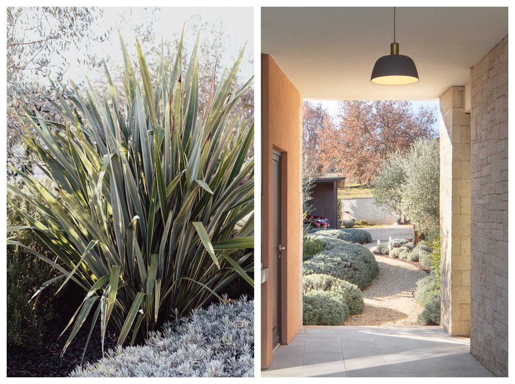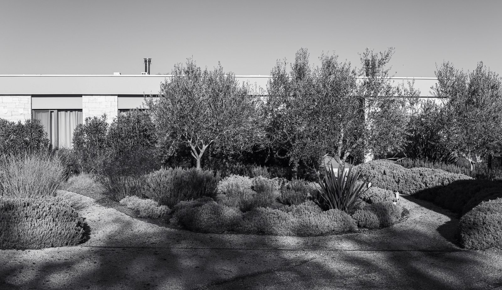Krajobrazno oblikovanje prati smirenu arhitekturu razvedenog prizemnog objekta, oslanjajući se na čiste linije, ponavljanje formi malobrojnih vrsta autohtonog mediteranskog bilja tipičnog za dvorišta lokalnog stanovništva (lavanda, ružmarin, kadulja, sedumi etc.). Sadnja je organizirana u jednolične organske poteze niskog grmlja zeleno-sive nijanse s intencijom peceptivnog ulijevanja okolne vegetacije prema objektu i van njega.